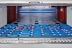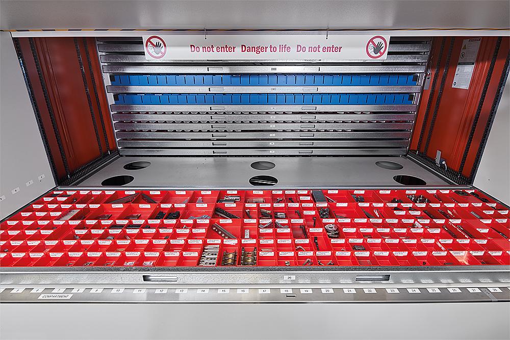 Położony centralnie w obszarze produkcyjnym firmy automatyczny regał Lean-Lift umożliwia przechowywanie wszystkich części zamiennych potrzebnych do utrzymania sprawności urządzeń produkcyjnych i maszyn. Automatyczny system magazynowy Lean-Lift dzięki wykorzystaniu maksymalnej wysokości budynku, od podłogi do sufitu, pozwala zaoszczędzić cenną powierzchnię produkcyjną przy jednoczesnym zapewnieniu maksymalnej przestrzeni składowania.
