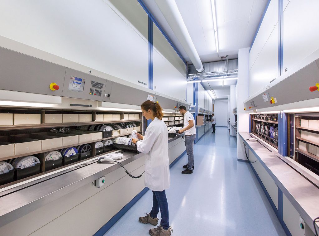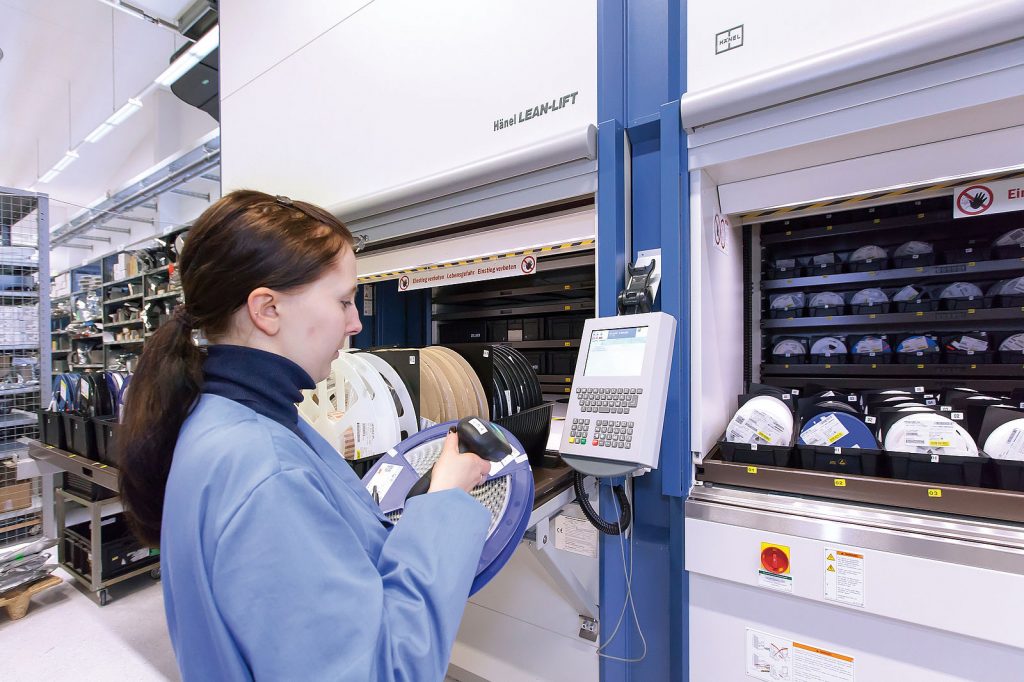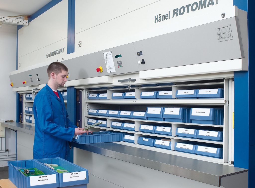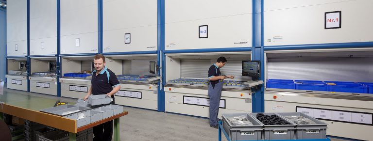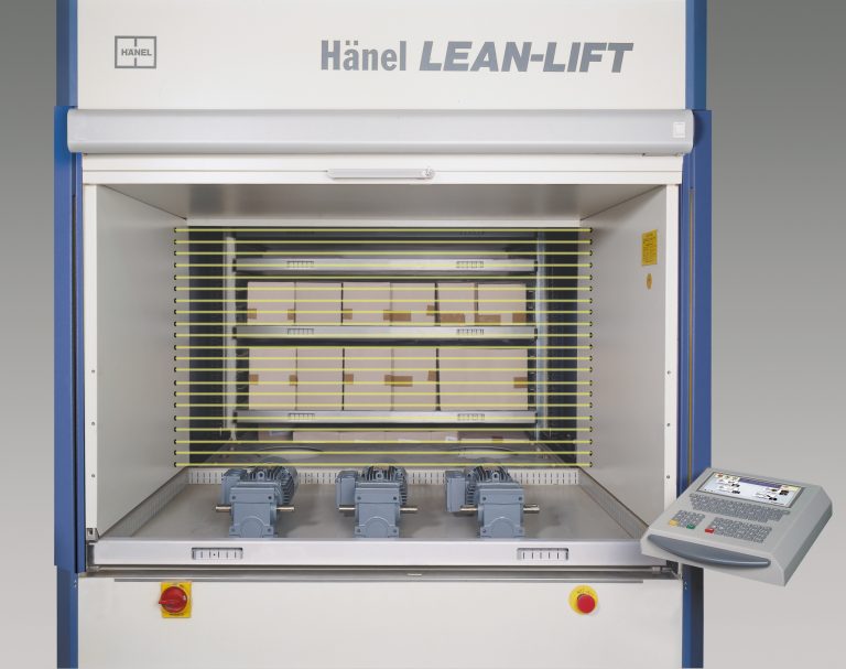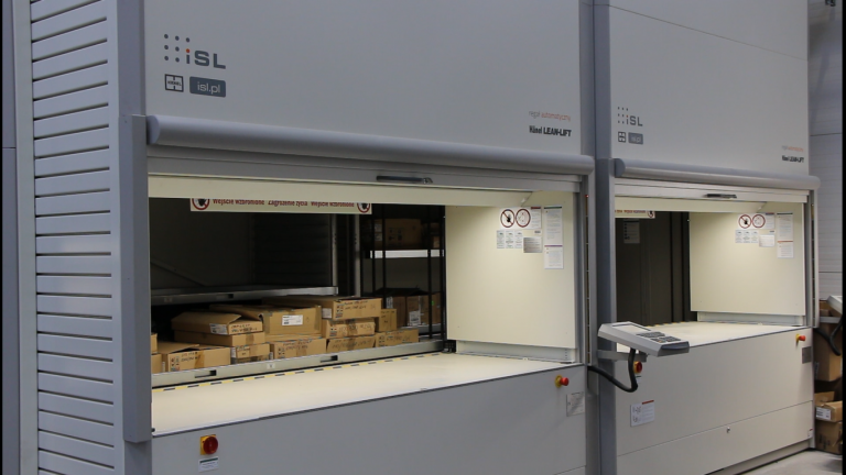 2 regały automatyczne Lean-Lift do składowania części zamiennych oraz środków BHP w dziale utrzymania ruchu, 2 regały automatyczne Lean-Lift wyposażone