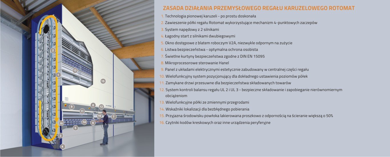 Regał przemysłowy Rotomat wykorzystuje możliwie najkrótszą drogę transportową, aby dostarczyć towary wprost do rąk. Rotomat wykorzystuje ruch karuzelowy w celu dostarczenia konkretnego produktu do pracownika. Działanie regału przemysłowego polega na pionowym ruchu półek po spłaszczonej elipsie na wzór pionowej karuzeli. W regałach paternoster kierunek ruchu półek uzależniony jest od tego w jakiej odległości od operatora znajduje się żądana półka.